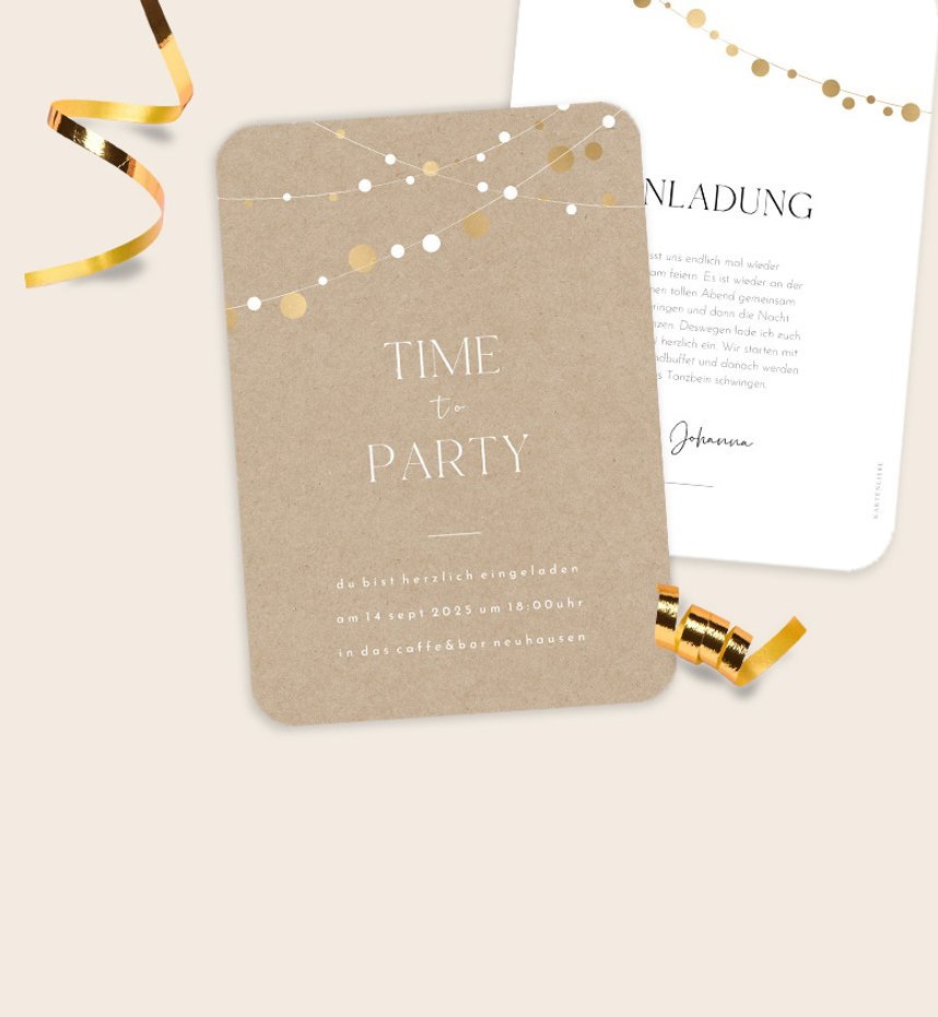 Ergeben sich während der Gestaltung Fragen zur Verwendung unseres Kartenkonfigurators oder zum Design Ihrer individuellen Einladungskarten, steht Ihnen unser fachkundiges Expertenteam gern beratend zur Seite. Haben Sie den Kreativprozess abgeschlossen, geben Sie den Druck Ihrer Einladungskarten mit einem Klick auf den Bestellbutton in Auftrag. Wir versenden Ihre Einladungskarten zuverlässig innerhalb von drei Werktagen. Benötigen Sie diese noch zügiger, bieten wir Ihnen zudem die Option Expressversand an. Bei Kartenliebe kreieren Sie originelle Einladungen für Ihre Party online!