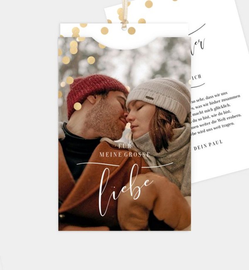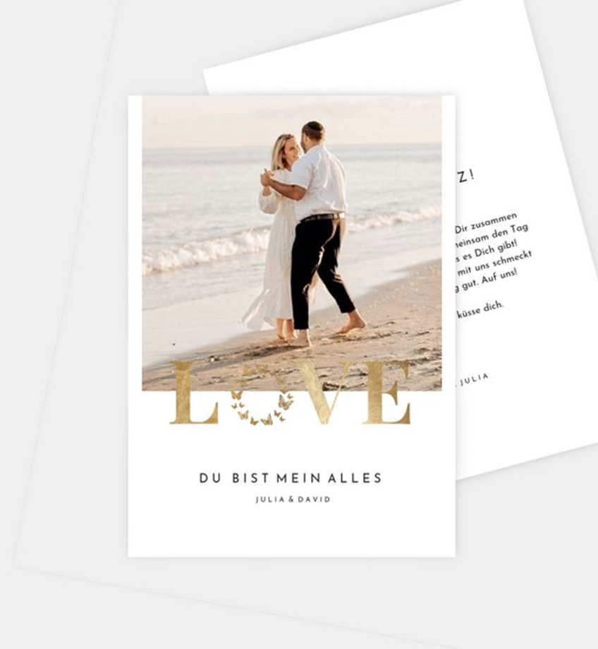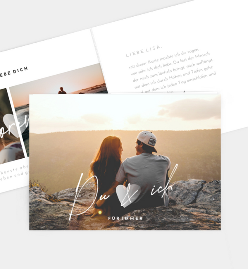 Liebessprüche zum Valentinstag sind ein Ausdruck der Liebe und der Wertschätzung. "Ich liebe dich" Sprüche machen sich auf Ihrer Karte immer gut. Um liebevolle Grüße zum Valentinstag zu ergänzen, machen Sie sich Gedanken zu Ihrem Lieblingsmenschen! Denken Sie an gemeinsam erlebte Momente zurück und zählen Sie Charakterzüge auf, die Sie an der Person lieben! Sie können Eigenschaften der Person in der Karte aufführen und diese in einen "Liebe ist" Spruch einbauen. Ihr Lieblingsmensch wird sich über Ihre Gedanken auf Papier mit Sicherheit freuen! Lassen Sie sich zu Geschenkideen zum Valentinstag inspirieren oder legen Sie die Karte einem Fotogeschenk zum Tag der Liebenden bei!