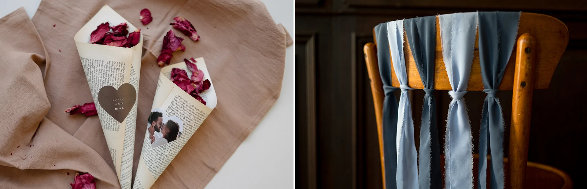 Streublumen sind perfekt, um beim Auszug des Brautpaars Stimmung zu erzeugen. Auch auf Hochzeitsfotos bringen geworfene Blumen eine tolle Dynamik mit sich. Ihr könnt bei eurer Floristin frische Streublumen anfragen, alternativ könnt ihr Trockenblumen besorgen oder selbst Blüten trocknen. Diese einfache Hochzeitsdeko Möglichkeit ist auch eine eindrucksvolle Überraschung, die Trauzeugen und Trauzeuginnen organisieren können. Die Streublumen können vor dem Auszug in hübschen Papiertüten verteilt werden, die ihr ganz einfach selbst machen könnt. Für die Basis der Papiertüte könnt ihr buntes Tonpapier zusammenrollen oder alternativ Buchseiten alter Bücher nutzen. Mit hübschen Aufklebern könnt ihr die Tütchen verschließen, hilfsweise mit transparenten Tesa zusätzlich und die Blüten hineingeben. Bei Kartenliebe könnt ihr Siegelsticker als Aufkleber nutzen und diese individualisieren, indem ihr schöne Sprüche, das Hochzeitsdatum oder ein Foto darauf drucken lasst. Ein schönes Detail, oder?