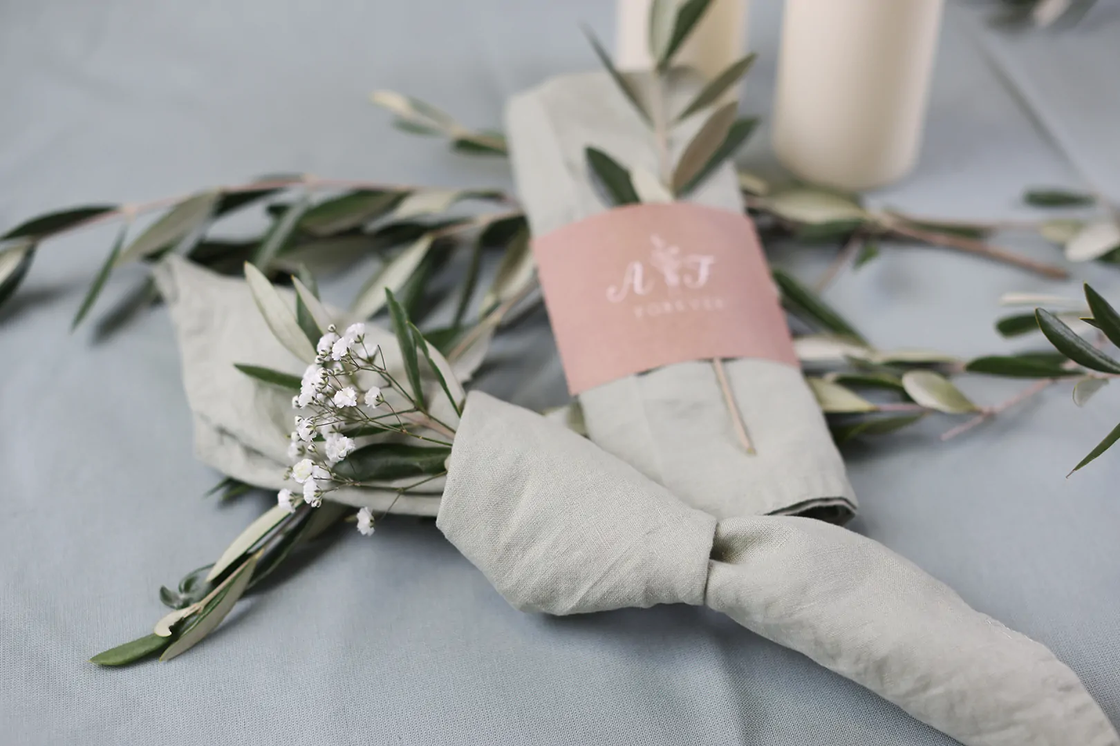 In die Serviettentasche könnt ihr viele weitere Dekoartikel außer den Zweigen integrieren. Orientiert euch hier im Idealfall an eurer restlichen Hochzeitsdekoration. So entsteht ein super stimmiges Bild an eurer Hochzeitstafel.