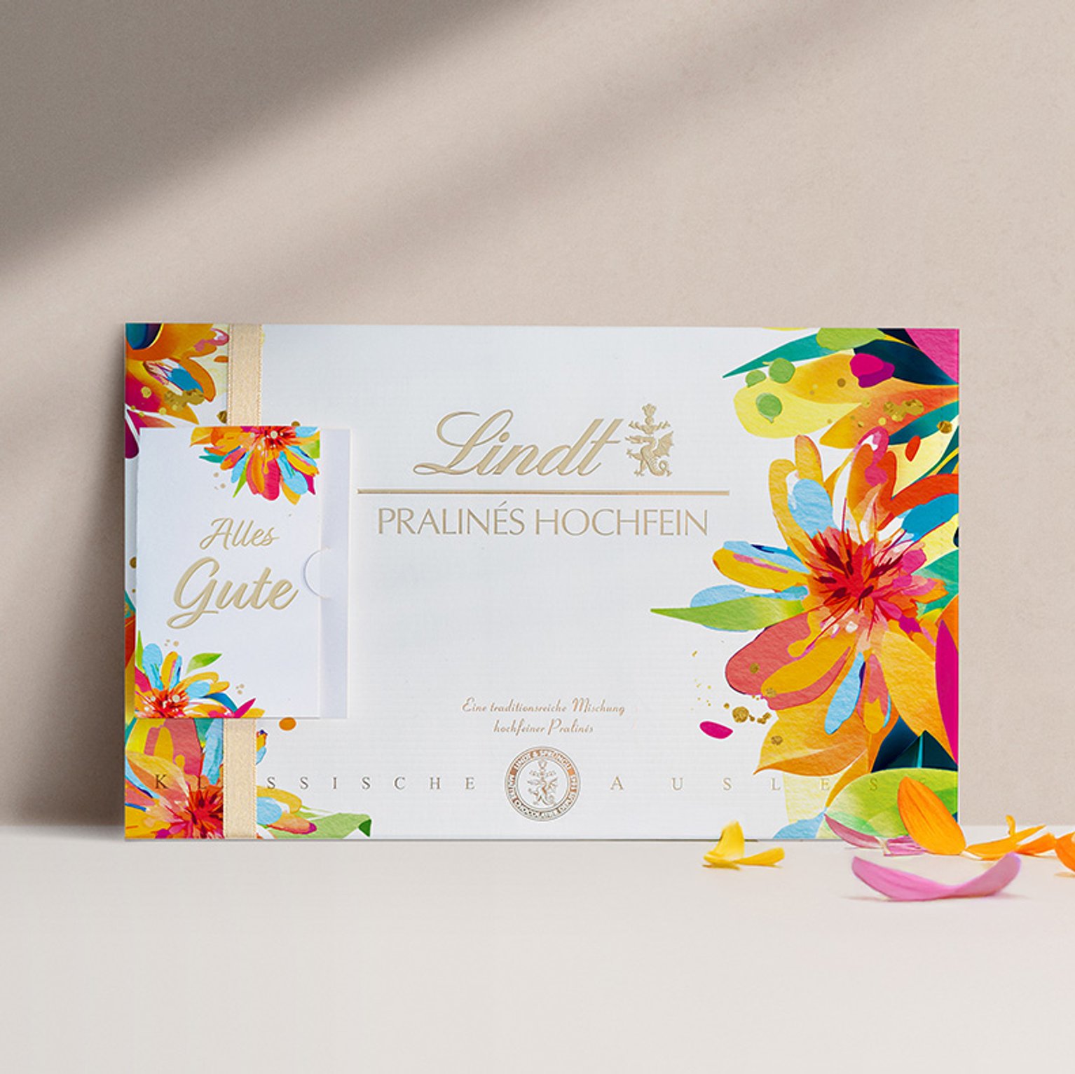 Frühlingsgefühle und farbenfrohe Leichtigkeit spiegeln sich in jedem Detail des Designs, das Lindt und Kartenliebe gemeinsam entwickelt haben, wider. Diese exklusive Kooperation zeigt, wie sich zwei Premium-Marken zu einem außergewöhnlichen Erlebnis vereinen: Lindt mit höchstem Anspruch an Genuss und Qualität und Kartenliebe mit erstklassiger Papeterie. Als liebevolle Aufmerksamkeit stehen die Pralinés Hochfein mit Grußkarte von Kartenliebe im floralen Design für höchste Qualität und stilvolle Eleganz. Verwöhnen Sie Ihre Liebsten mit einem Präsent, das Genuss, Stil und Persönlichkeit verbindet!